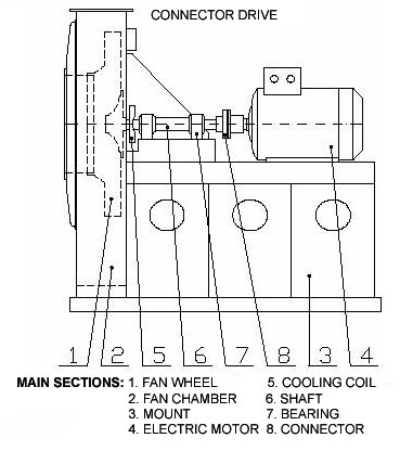 RVE - S 315, 400, 500, 630, 800, 1000 1250 and 1600 fans are high pressure fans with electric motor drive via a flexible connector. The wheel is anchored over the shaft in fans powered via a connector. Eight various fan wheels can be used to expand fan performance (wheels numbered 1 to 8). Regulation accessories can also be connected to the fans. The fan shaft is located in roller bearings in individual blocks or in shared bearing housings. At temperatures above +100°C the bearings are cooled using a cooling coil tat is located on the shaft between the fan chamber and bearing housing. The fan chamber is welded and there is an access panel at the lowest point. An inspection opening is located in the fan chamber. The fans and electrical motors are placed on a common table. They are anchored directly to a concrete base or a flexible base using vibration dampers (silent blocks). The fans are produced in two forms: normal or armoured. Armoured fans have a strengthened fan wheel and the fan chamber is reinforced with a hardened steel insert. Fan wheels are dynamically balanced so the performance losses and foundation vibrations are kept to a minimum.